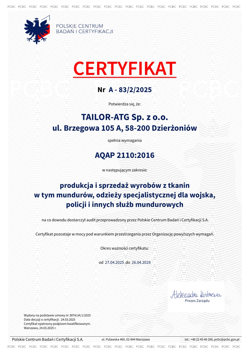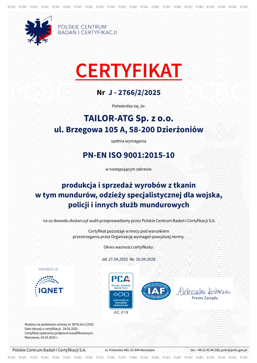 Zakład posiada odrębny Dział Kontroli Jakości, który sprawuje nadzór na każdym etapie produkcji. Spółka Tailor ATG to również wykwalifikowany i doświadczony zespół przygotowania produkcji zapewniający naszym klientom możliwość wdrożenia nowych wzorów oraz technologii.